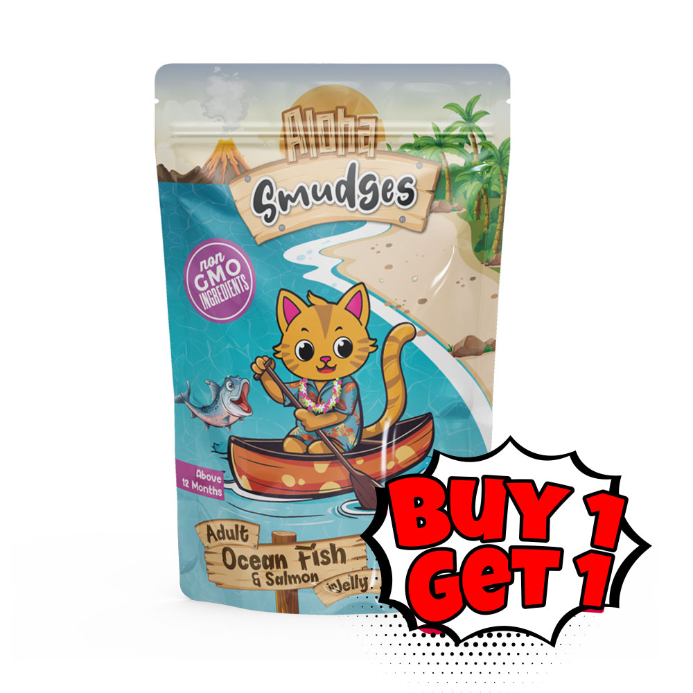 Buy one Get one Aloha Smudges Ocean Fish & Salmon Adult Cat wet food in Jelly 85g Pouch